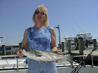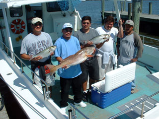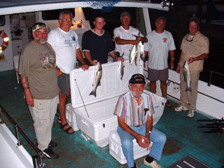 Here we have the Hazen Wilson crew from September 5, shown with part of their catch of rockfish, blues and Spanish Mackerel. From left to right behind Fred (seated), that's Rob, Rick, Ross, Fred, Hazen, and Bill. |